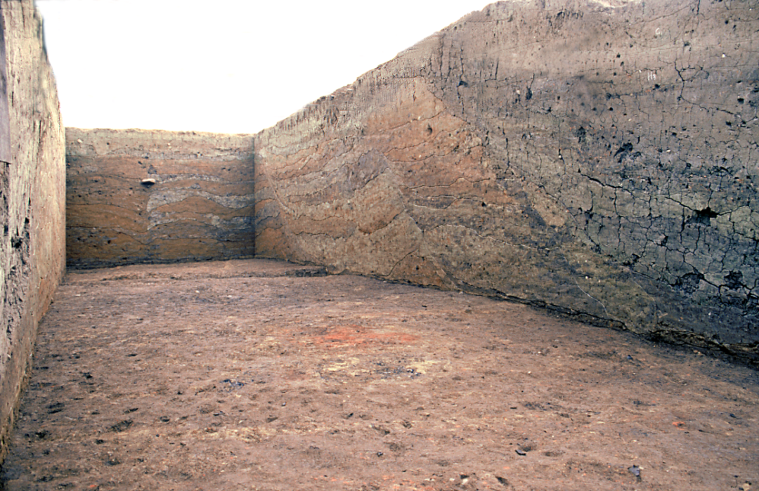 1999年发掘月亮湾城墙探方剖面(由西向东摄)。图据三星堆博物馆
