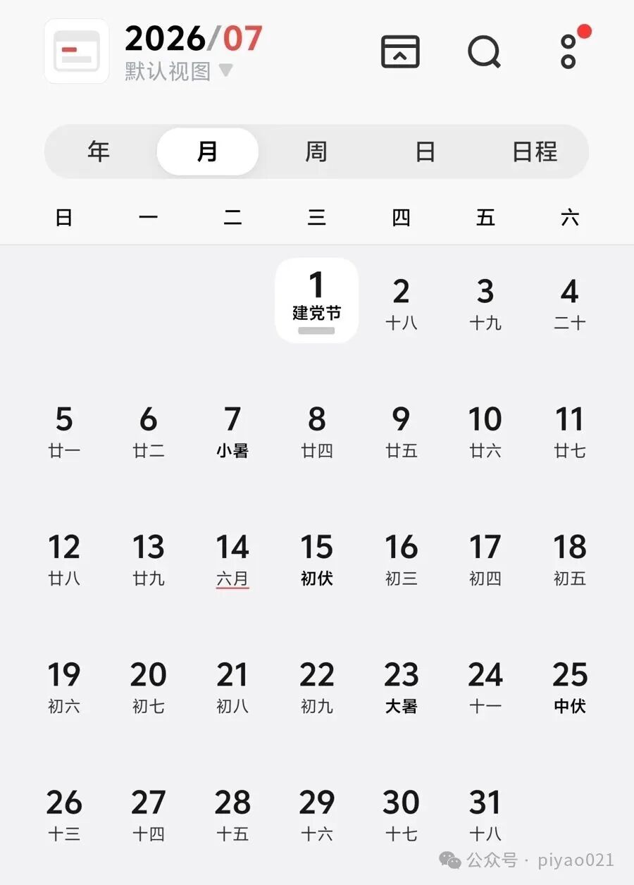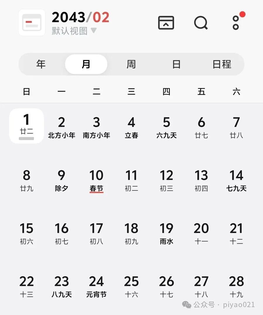 某手机自带日历显示的2026年2月(截屏)