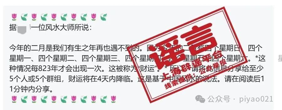“今年的二月是我们有生之年再也遇不到的。因为今年的二月有四个星期日、四个星期一、四个星期二、四个星期三、四个星期四、四个星期五和四个星期六。这种情况每823年才会出现一次。这被称为’财运’。所以,请将此信息分享给至少5个人或5个群组,财运将在4天内降临……”近日,有粉丝向上海辟谣平台发来上述消息截屏,希望辟谣。