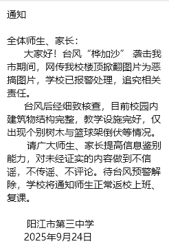 9月24日,网传“阳江市第三中学、第七中学受‘桦加沙’台风影响,发生教学楼楼顶被掀翻的坍塌事故”,引发网友关注。
