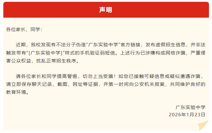1月23日,广东实验中学发布声明表示,有不法分子伪造“广东实验中学”官方链接,发布虚假招生信息,并非法触发带有“[广东实验中学]”样式的手机验证码短信。上述行为已涉嫌构成网络诈骗,严重侵害公众权益,扰乱正常招生秩序。